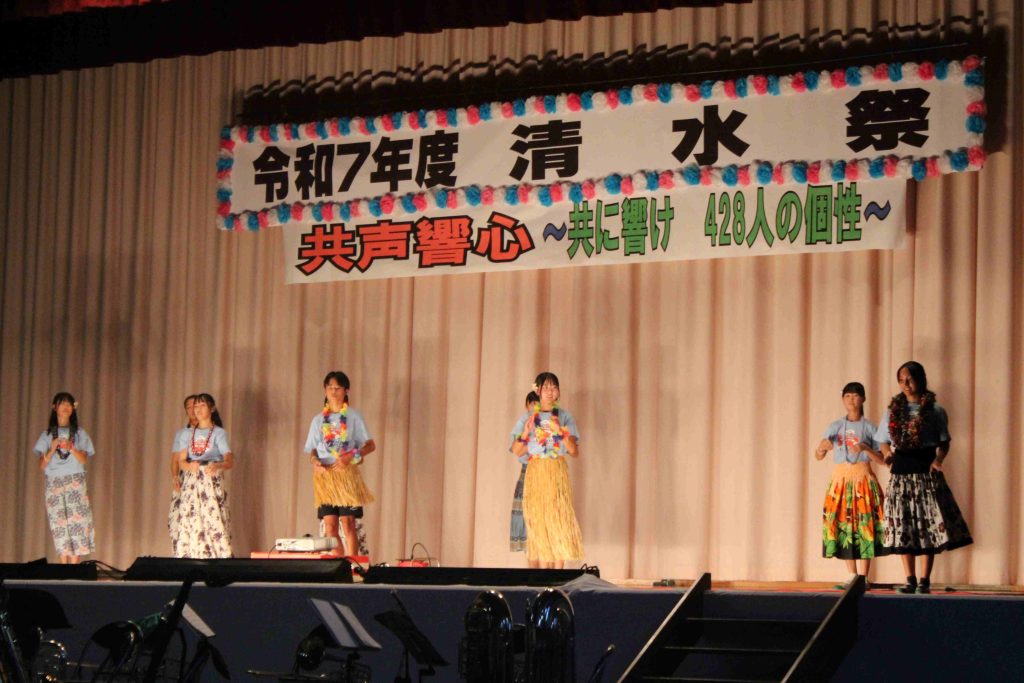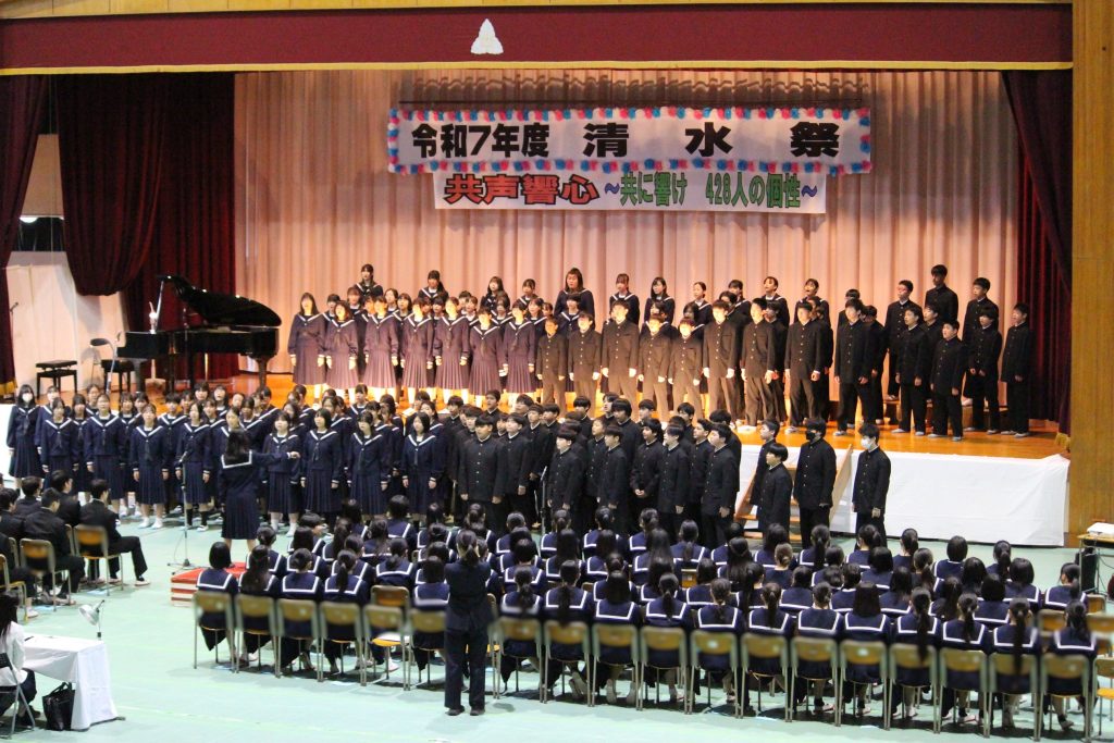 10月24日(金)に、第38回清水祭を開催しました。今年度のスローガンは「共声響心~共に響け 428人の個性~」です。合唱コンクールの部では、どの学級も美しい歌声を響かせていました。パフォーマンスの部でも、生徒達はそれぞれの「一生懸命」を披露しました。心に残る感動的な文化祭でした。